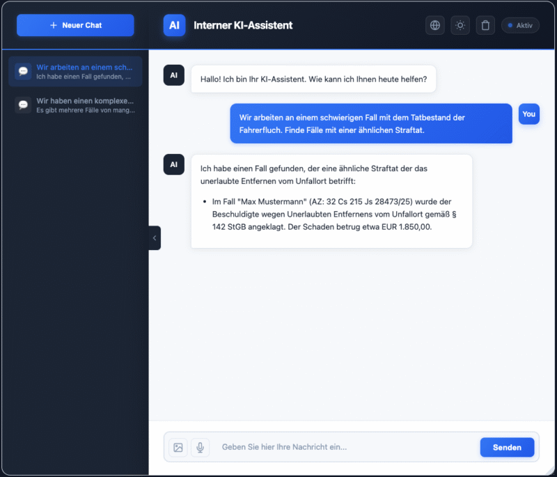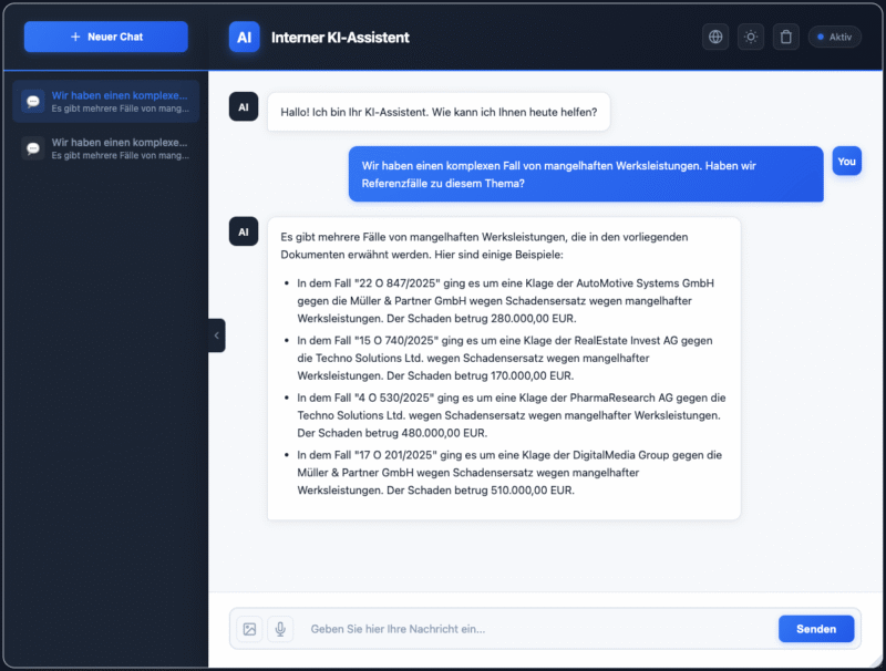 Wie sieht so etwas im Unternehmenseinsatz aus? Nehmen wir unseren Use Case einer Kanzlei*. Wir haben ein System aufgebaut, das hunderte Seiten komplexer Schriftsätze in Sekunden durchsuchbar macht.